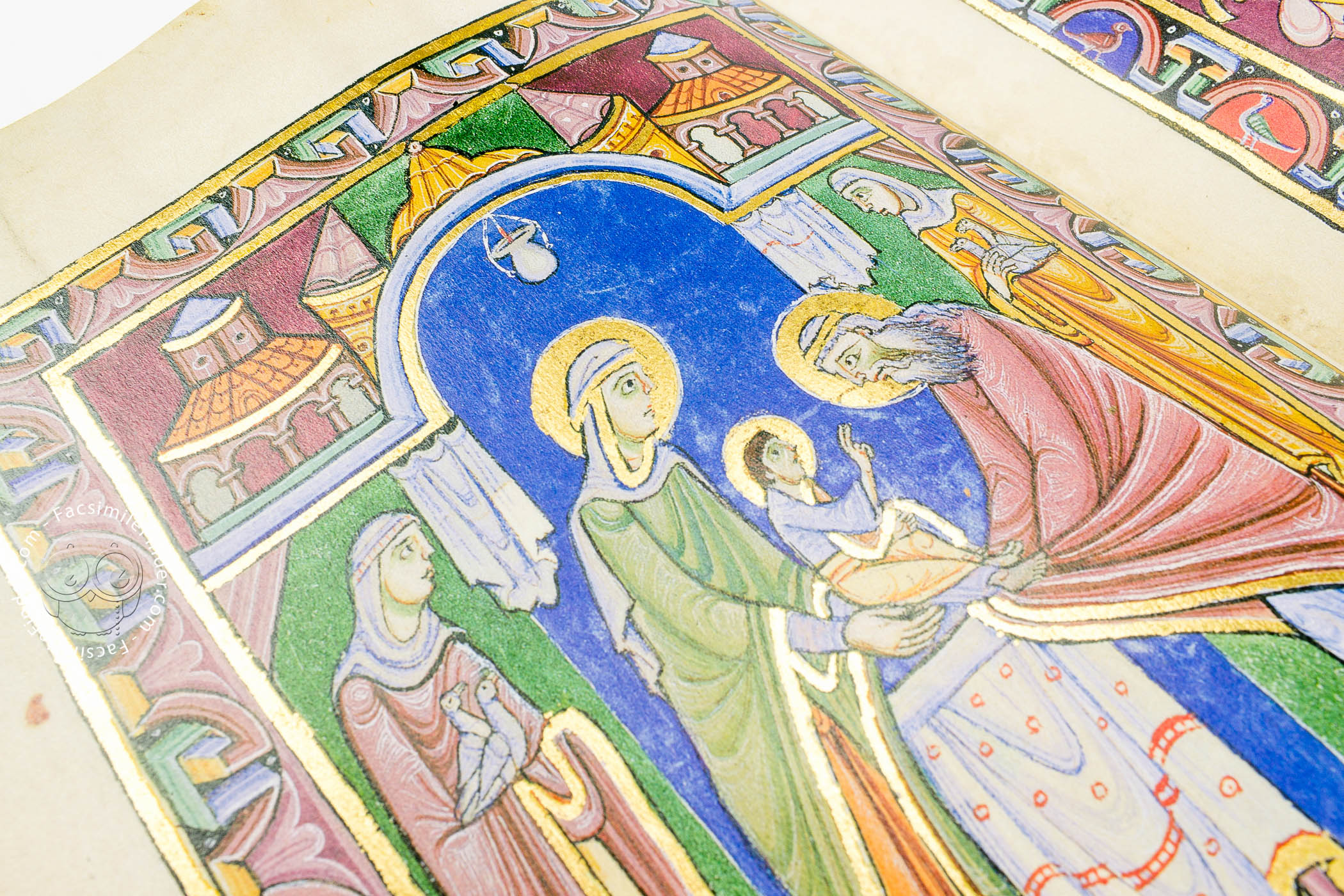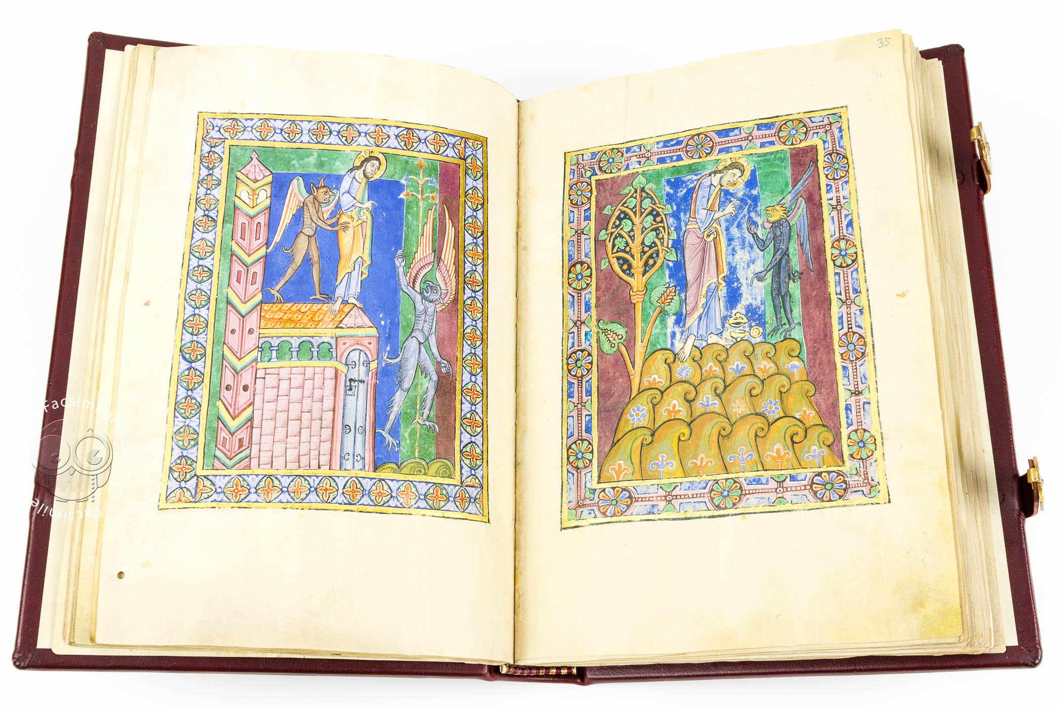 The impressive sequence of 46 illuminations are representative of the English Romanesque illumination style. Elegant and extremely elongated figures characterize the scenes. The illuminators used deep colors enlightened by a few rays of light. The lightening effect is probably derived from Byzantine works. The architectural constructions are important in the pictorial compositions.