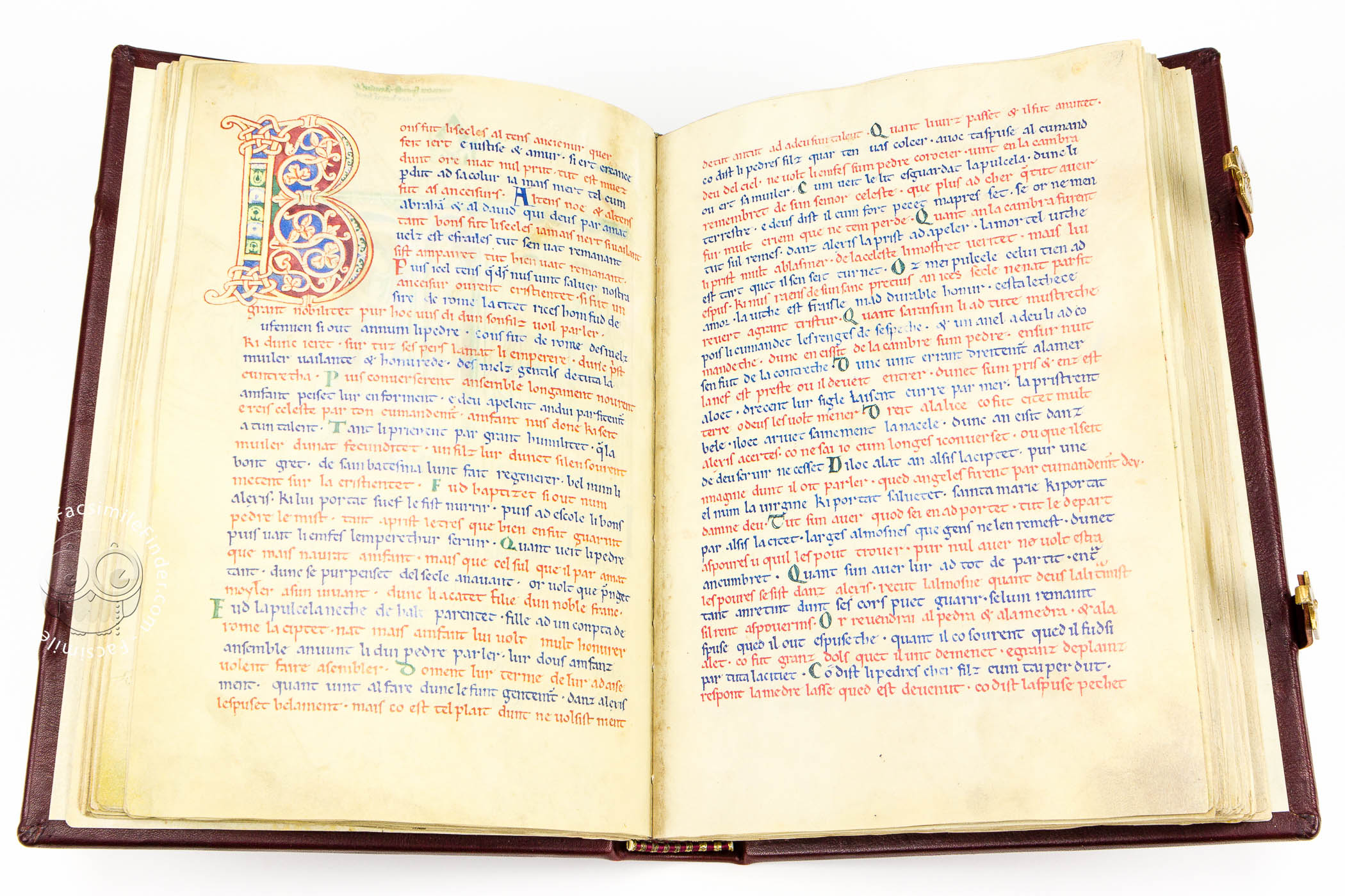 The outstanding cycle of miniatures might explain why the codex includes unusual texts focused on the educational function of images. Along with the 150 Psalms of the Gallican version and the Life of St. Alexis, an antique text of literature in Old French, the codex contains the letter of Pope Gregory the Great written in defense of the use of images. This letter explains that those who cannot read can find in pictures what they cannot understand in the texts.
