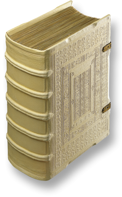 In mühevoller Handarbeit wurden der Ganzledereinband, die Prägungen auf dem Leder und die Buchschließen nach dem Original angefertigt. Die Blätter wurden von Hand auf fünf echte Bünde geheftet.