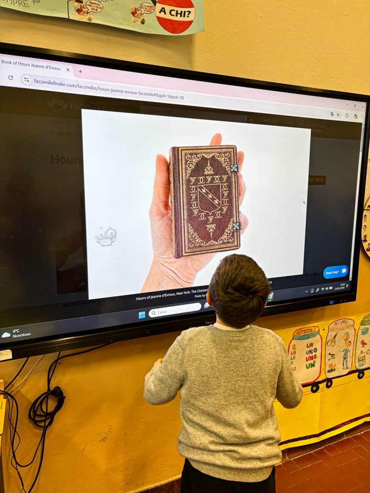 From papyrus, the lesson moved on. Facsimile editions on parchment and paper were introduced—objects representing different centuries, styles, and purposes. Together, the class reflected on what a book is, and how its meaning has changed over time: from a luxury object of prestige, enriched with illumination and artistry, to a mass-produced item of daily use—often without images at all.