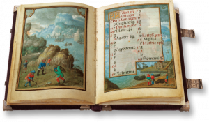 Das Fragment eines Stundenbuches aus dem 16. Jahrhundert ist einer der schönsten Landschaftszyklen und ein Meilenstein flämischer Buchmalerei. Simon Bening revolutionierte in diesem Werk die Kalenderminiaturen, indem er ihnen je zwei Seiten einräumte und sie als eigenständige Szenen behandelte.