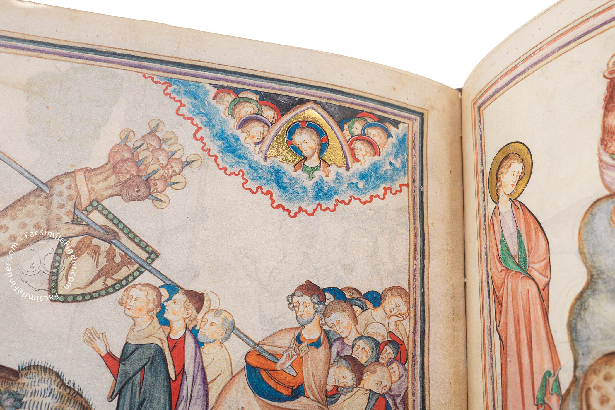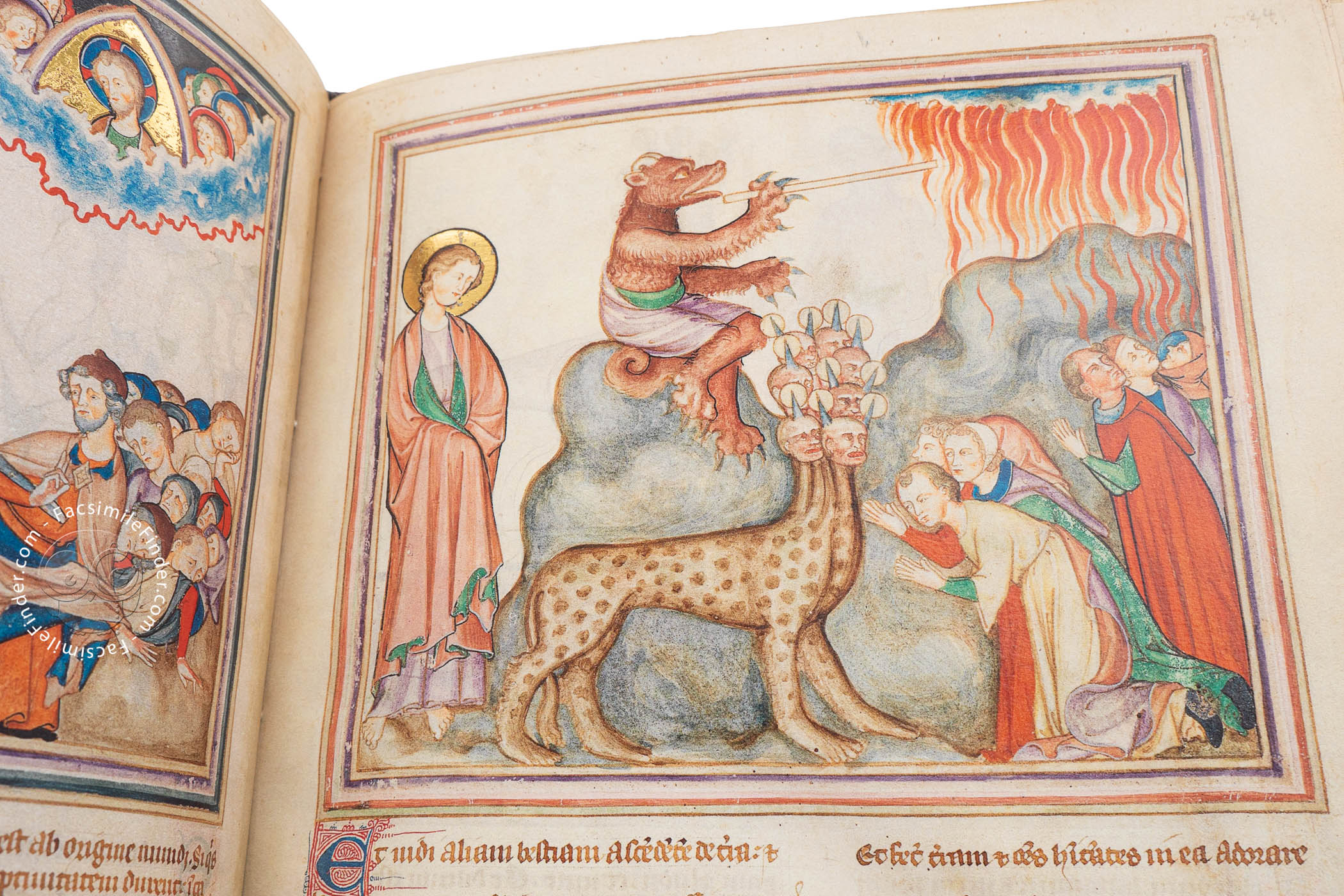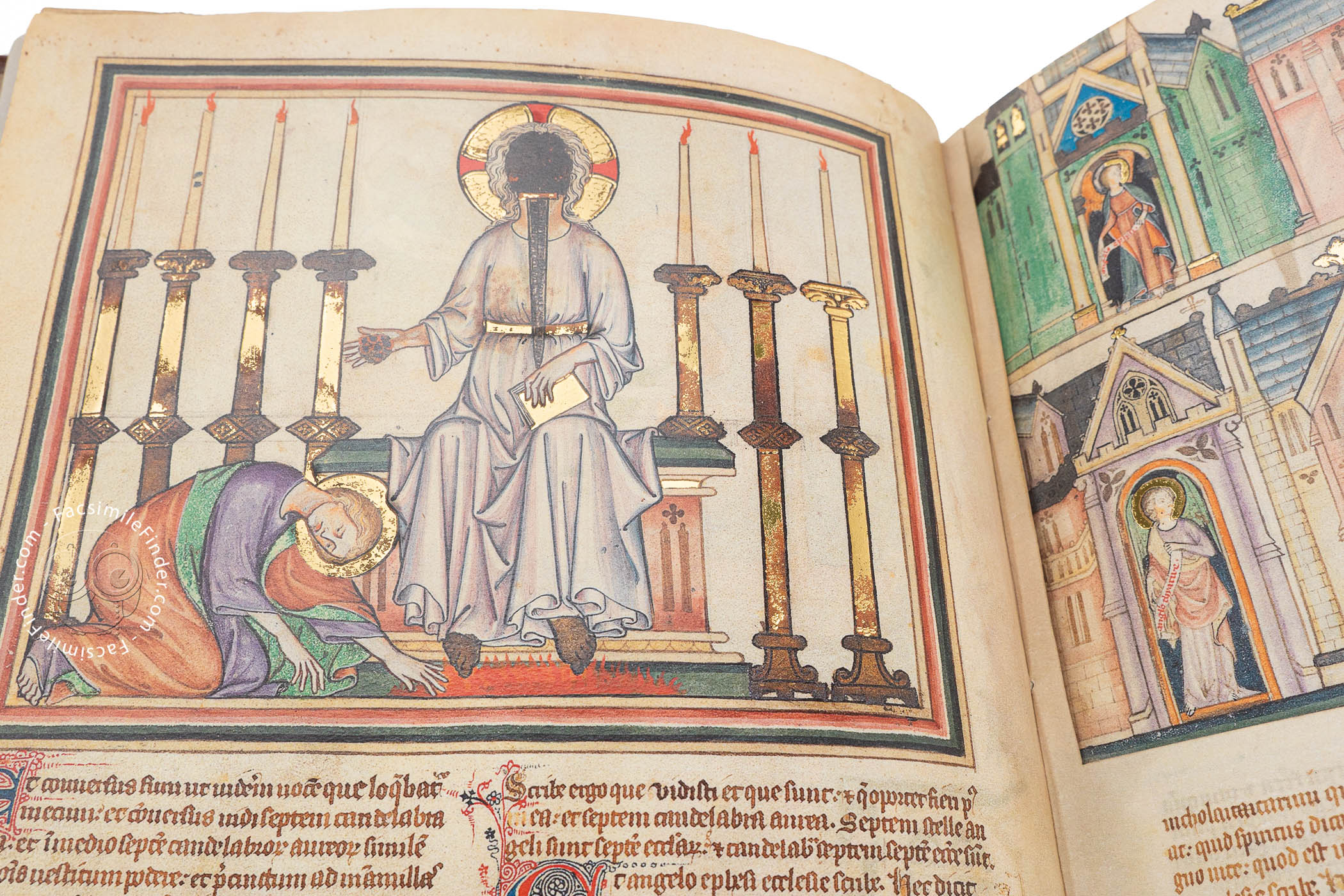 The Cloisters Apocalypse is an exceptionally fine example of the elegant Gothic manuscript illumination created in Normandy in the early fourteenth century. Its text is Saint John the Divine's description of his vision of the events at the end of time that forms the last book of the Christian Bible. Its miniatures are stylistically and iconographically related to those of the Val-Dieu Apocalypse and the Apocalypse of Saint-Victor, as well as other manuscripts. The manuscript features seventy-two framed miniatures.