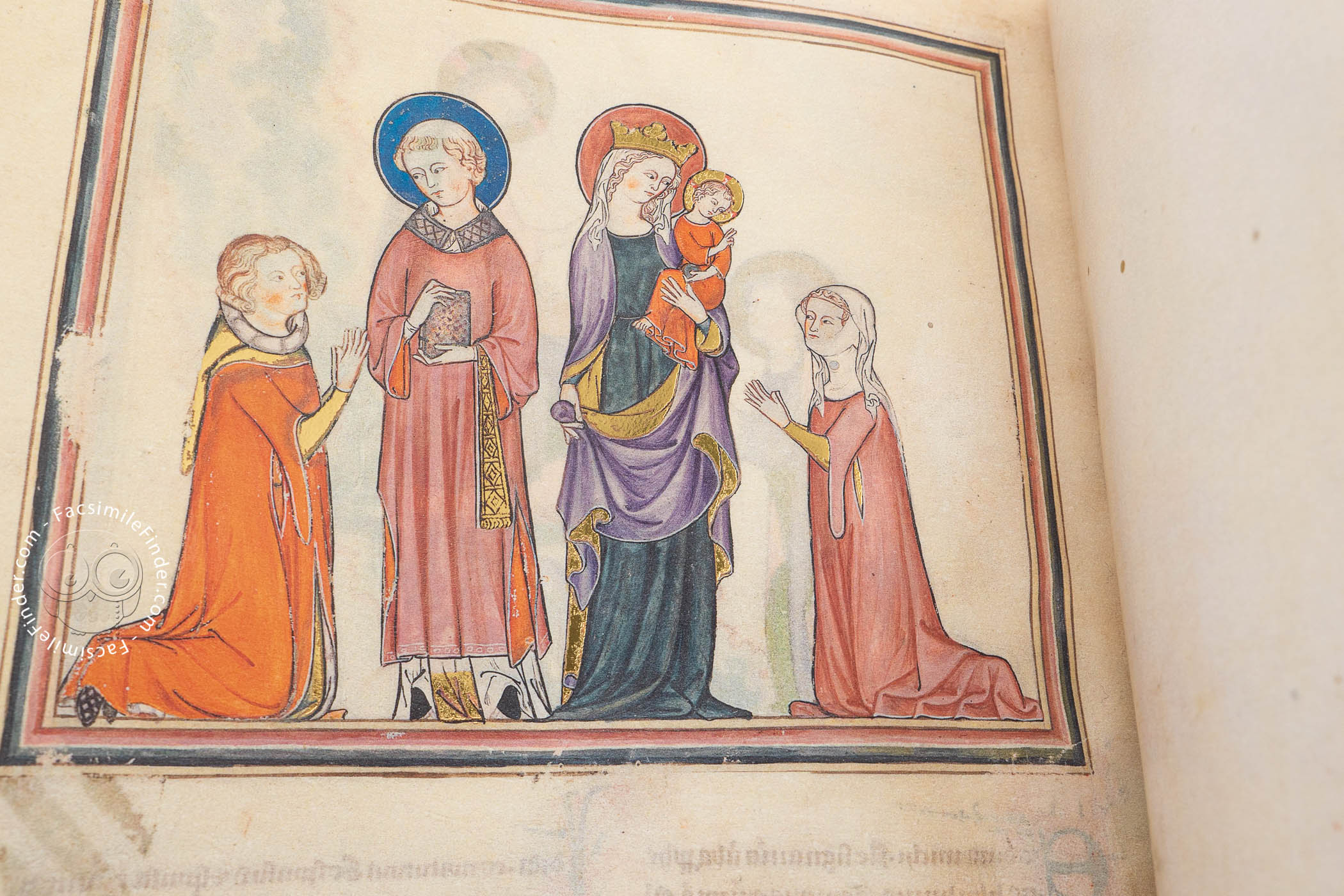 The last image in the manuscript shows a couple kneeling, the man praying to Saint Stephen and the lady to the Virgin Mary holding the infant Jesus, who makes the sign of blessing to the lady (fol. 38v). The couple was once identified by painted coats of arms, which have been effaced. Nevertheless, the lady has been identified as a member of the Montigny family.