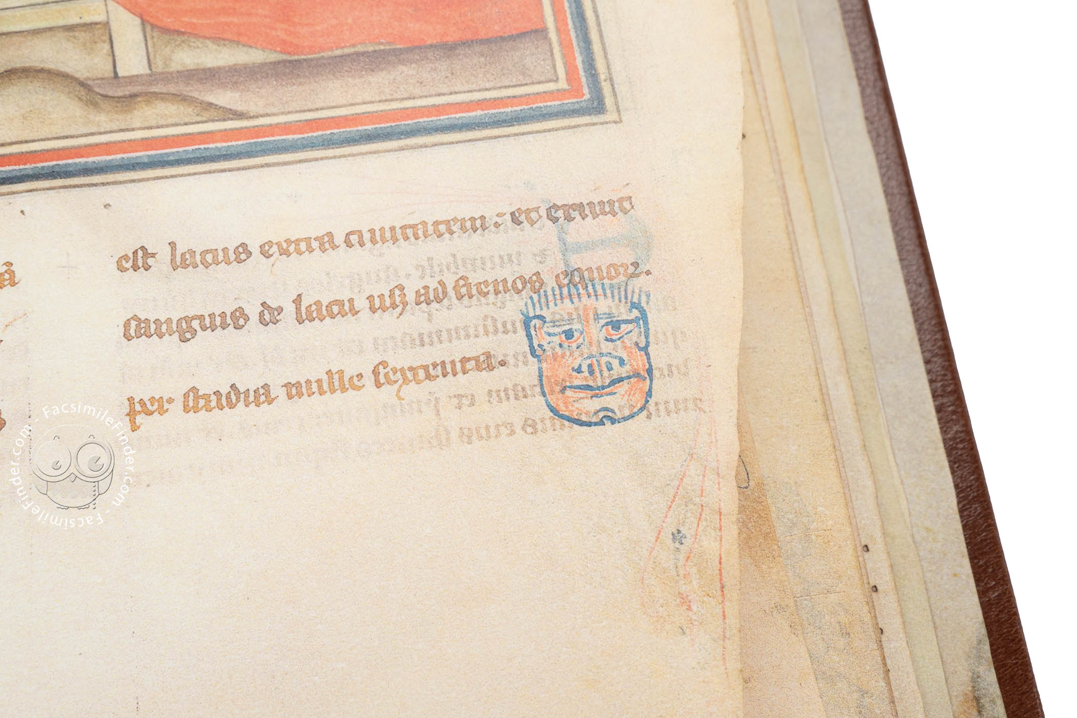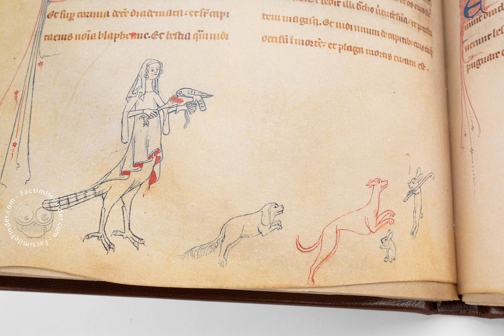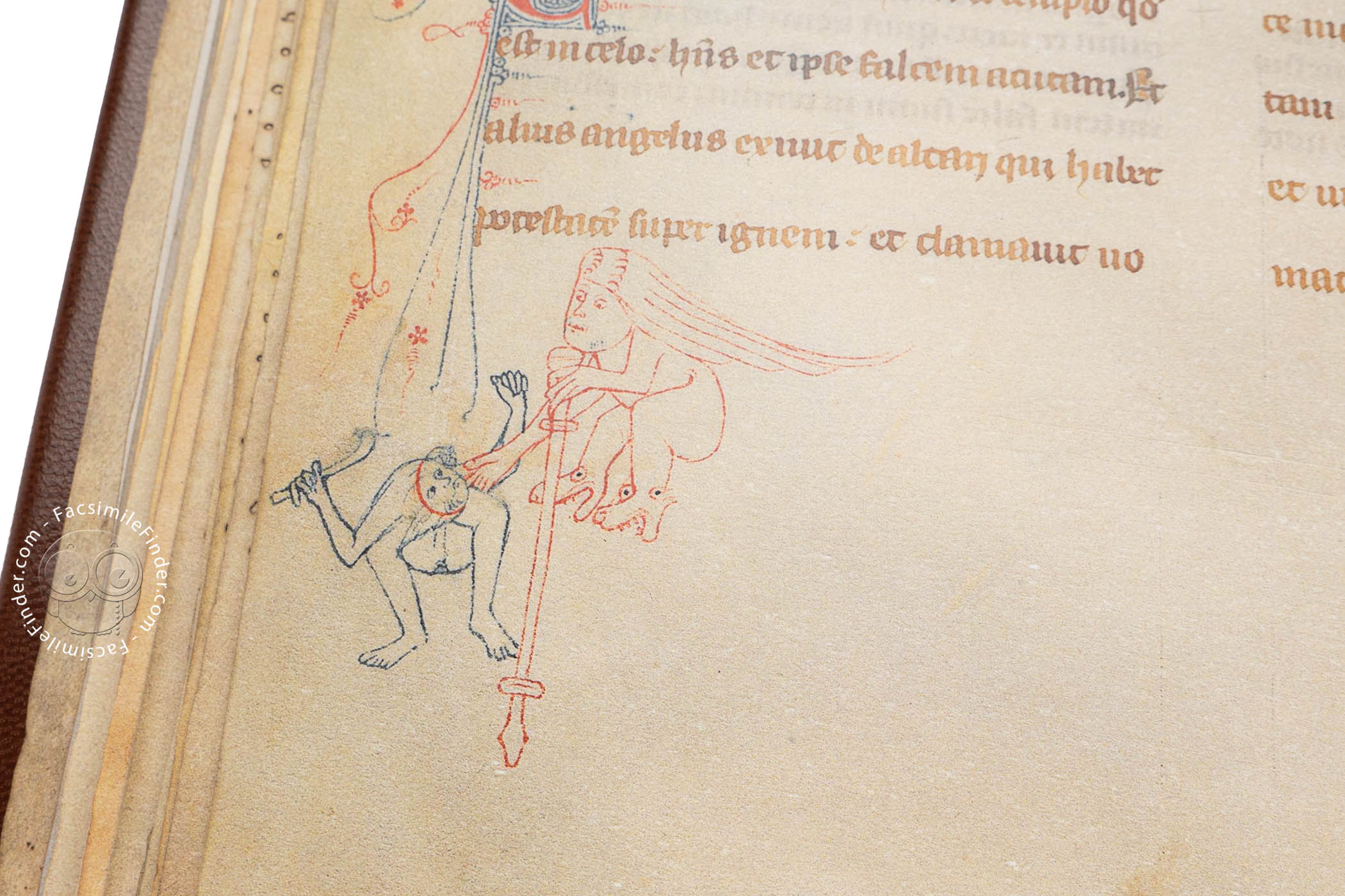 The Latin text of the Apocalypse is written in two columns beneath the large illustrations in a Gothic Textualis script. Each section of the text begins with a pen-flourished initial, alternating between red with violet flourishing and blue with red flourishing. The craftsperson responsible for these initials also executed delightful marginal drolleries in red and blue ink of animals, birds, and fantastic hybrid creatures.