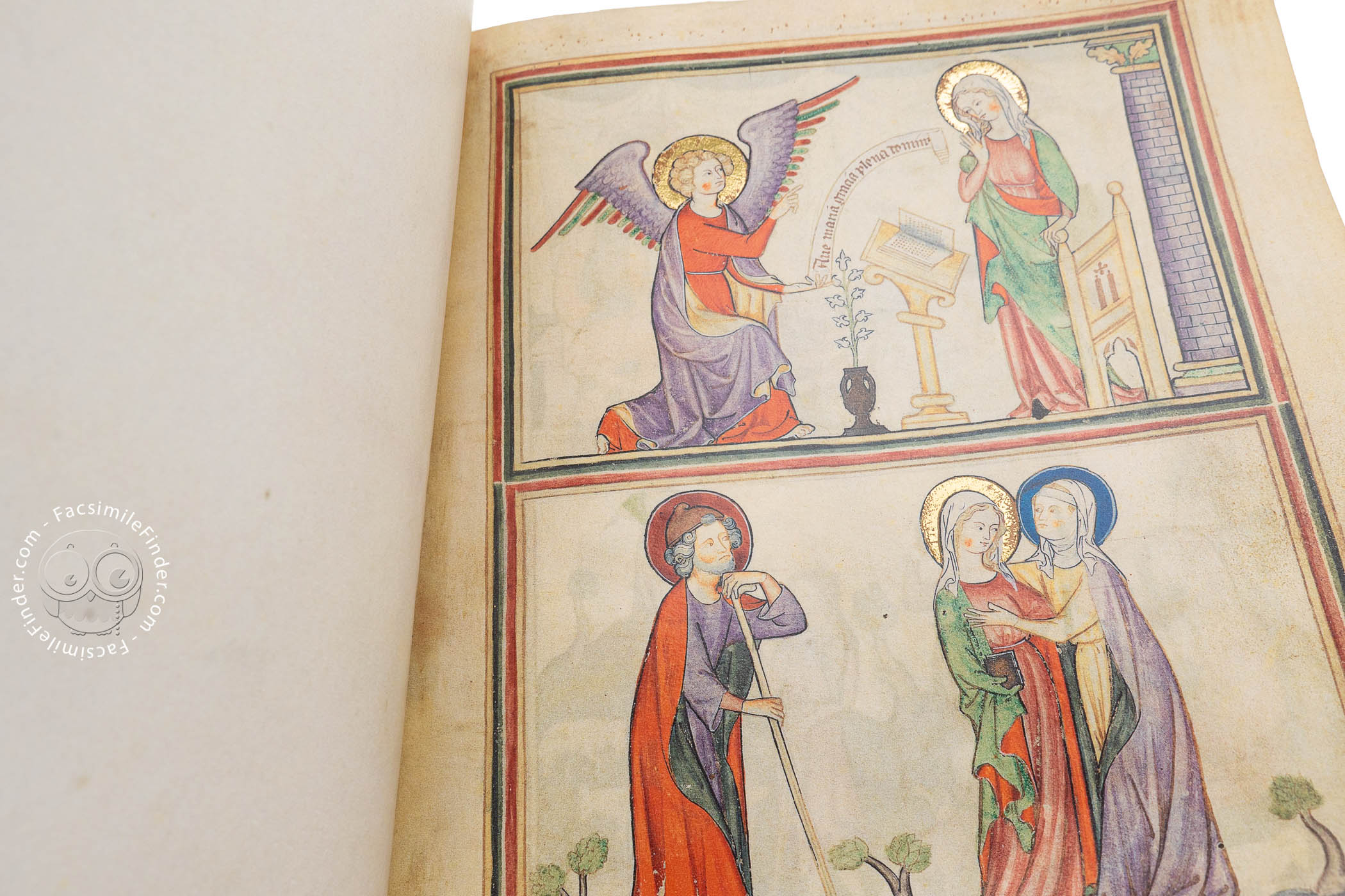 The manuscript's half-page miniatures illustrating the text of the Apocalypse reflect the English tradition for illuminated Apocalypse manuscripts. Unusually, the book begins with a pictorial cycle of four full-page miniatures in two registers depicting eight scenes from the infancy of Christ, beginning with the Annunciation to the Virgin and ending with Flight into Egypt (fols. 1r-2v).