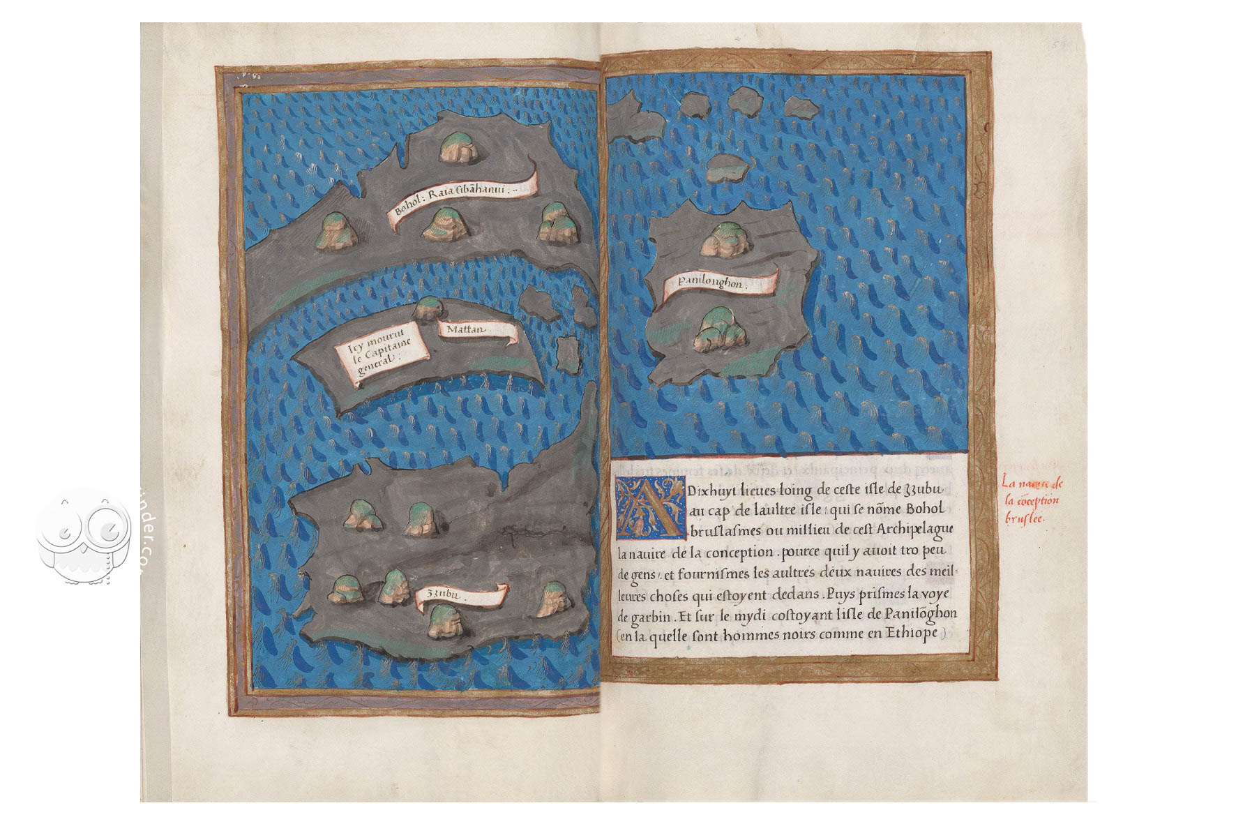 The Journal of Magellan’s Voyage (Beinecke MS 351) is a richly illuminated early-sixteenth-century manuscript in French, attributed to Antonio Pigafetta, one of the few survivors of Ferdinand Magellan’s 1519–1522 circumnavigation. Comprised of 98 parchment folios, the volume features twenty-three full-page maps framed in gold, decorative initials in red, blue, and gold, and marginalia inscribed in a concise, humanistic hand. The text, divided into fifty-seven chapters, represents the most complete and finely produced of the four extant versions of Pigafetta’s narrative.