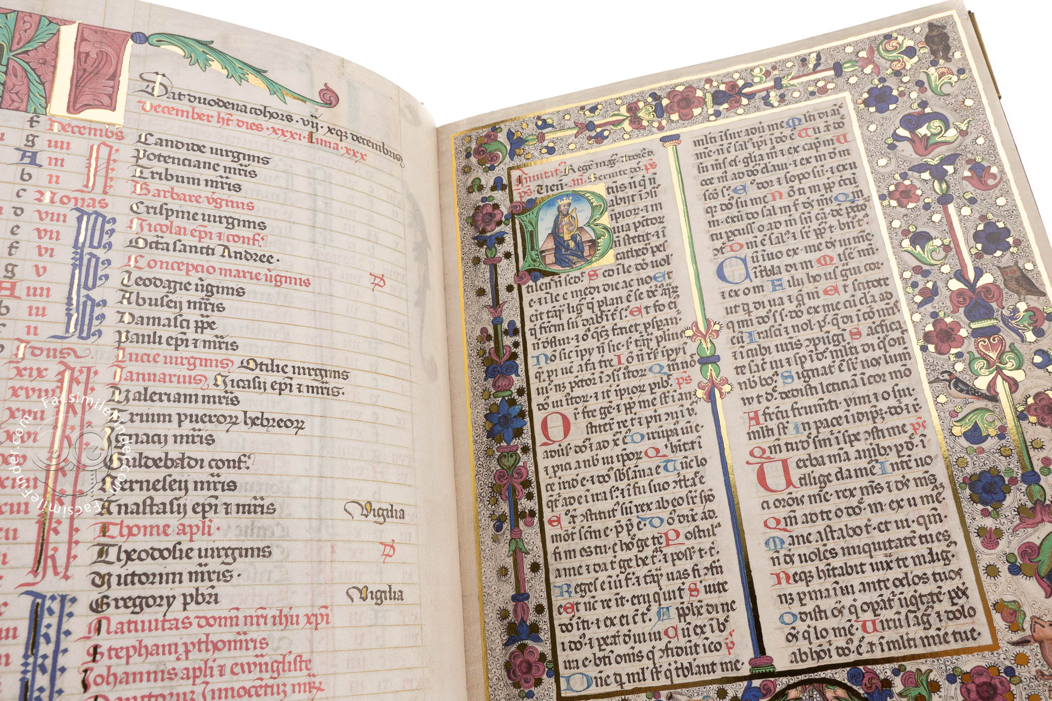 Crafted on parchment, the codex served to assist the prelate in fulfilling his liturgical and devotional responsibilities, with the first half functioning as a breviary—a priest’s prayer book—and the latter half serving as a mass book. At the outset of the codex, a calendar was included, delineating the sequence of the church year’s feasts. The compact size and the inclusion of two distinct liturgical texts within a single volume suggest that Domonkos Kálmáncsehi may have primarily utilized this codex during his travels.