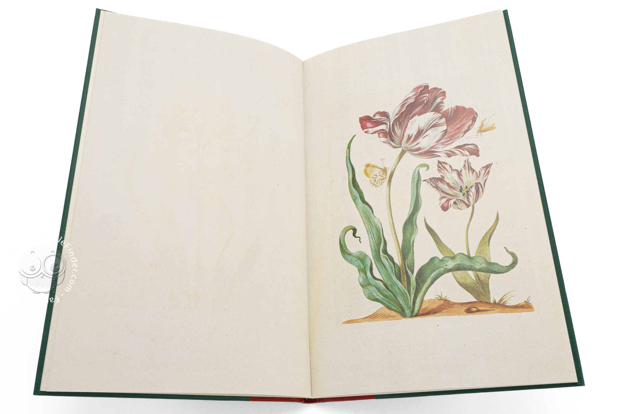 The New Book of Flowers—Neues Blumenbuch—collects thirty-six precise engravings of flowers and insects by Maria Sibylla Merian, an artist renowned in her own time. It was published in Nuremberg in 1680. A typical plate features a single flowering plant accompanied by a butterfly or other insect(s). The engravings of the copy in the Sächsische Landesbibliothek were expertly hand-colored, perhaps by Merian, who is known to have worked closely with the publisher. According to Merian's introduction, the images were intended to serve as models for embroidery.