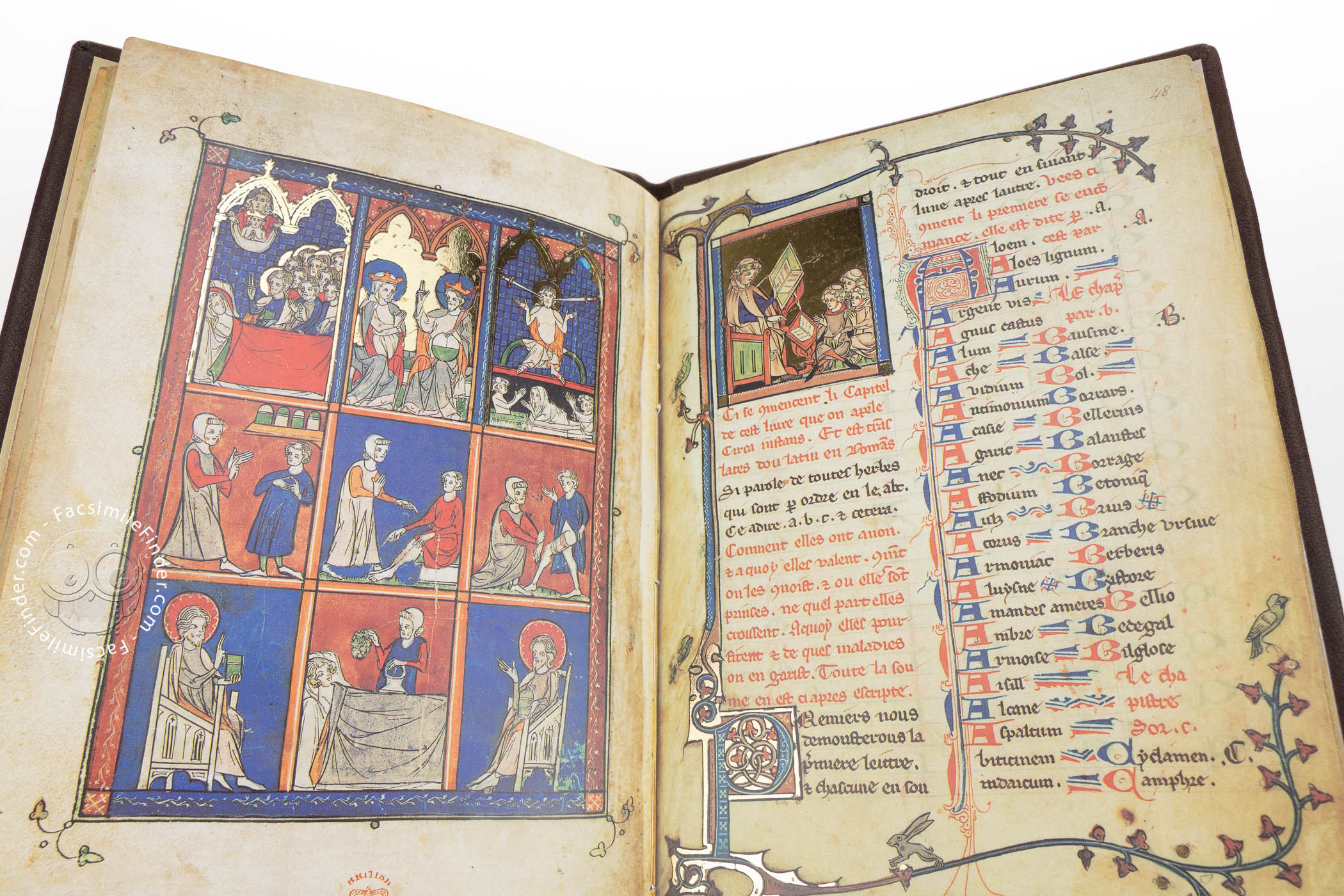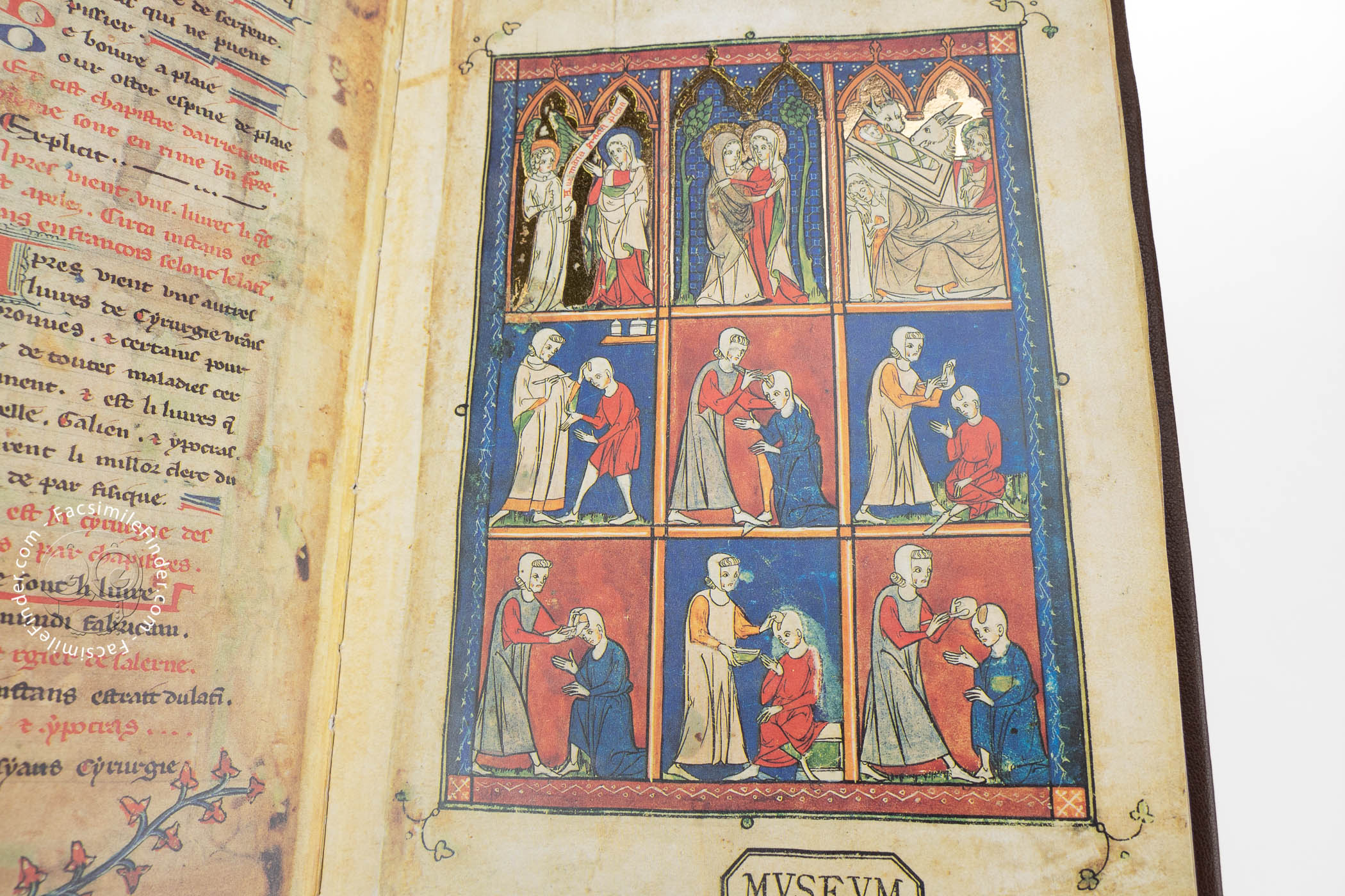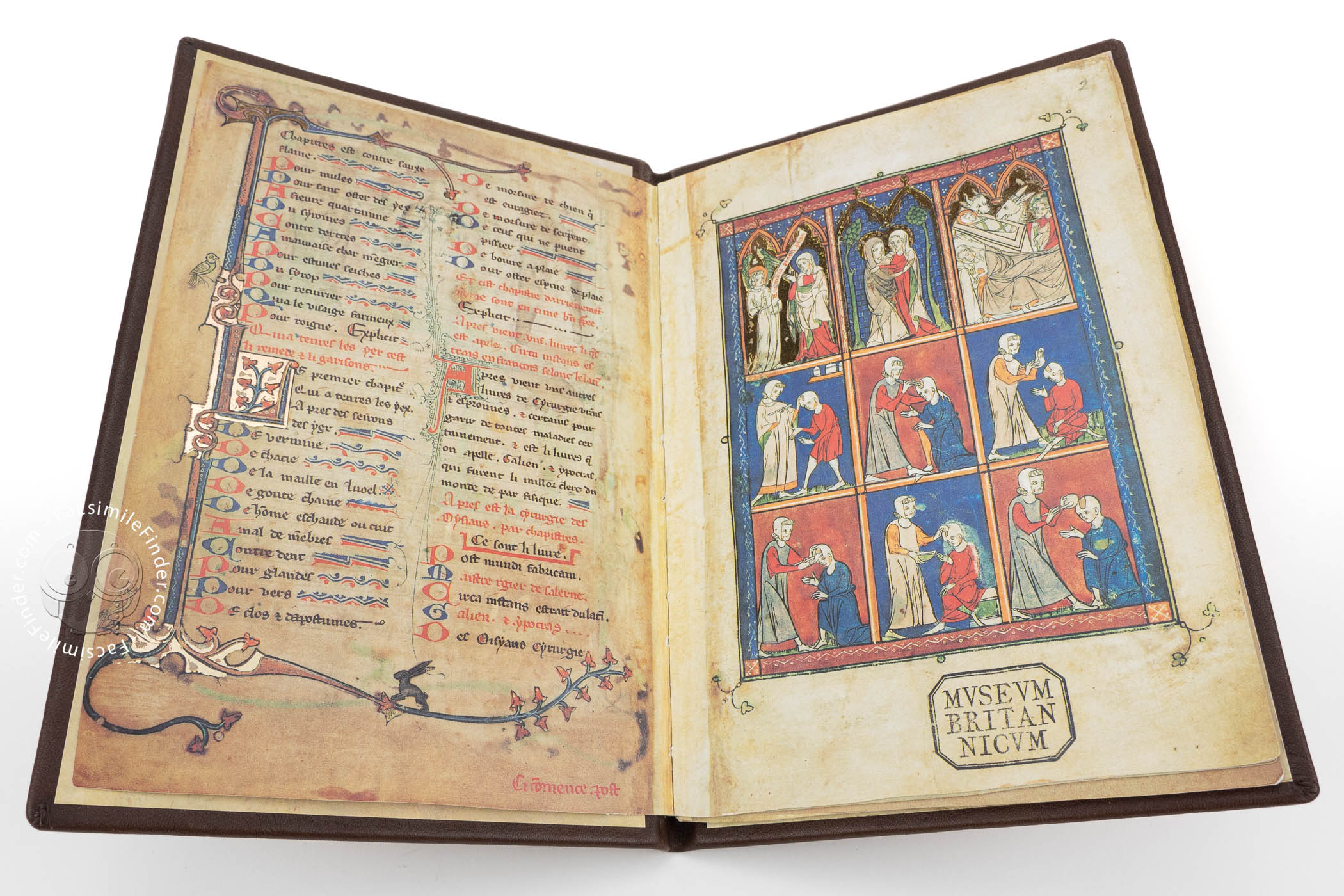 The Sloane Medical Collection is a luxuriously illustrated manuscript produced in France, probably Amiens, at the beginning of the fourteenth century. The book is a compilation of scientific and medical texts, including Rogerro Frugardo's Chirurgia and the Circa instans by Matthaeus Platearius. The twenty full-page and five smaller miniatures are painted in saturated pigments, primarily red and blue, with details in gold. The images are principally on medical subjects, including surgeries and illness symptoms, but some Christian narrative scenes are also present.